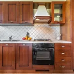 La pequeña cocina siempre viene con nevera grande, un horno y utensilios de cocina.